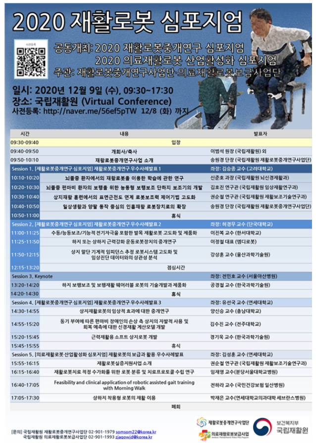 [2020 재활로봇심포지엄] - 날짜: 2020년 12월 9일 (수) - 시간: 09:30~ 17:30 - 장소: 국립재활원 나래관 (Virtual Conference) - 주관: 국립재활원 재활로봇중개연구사업단/의료재활로봇보급사업단 사전등록: http://naver.me/56ef5pTW