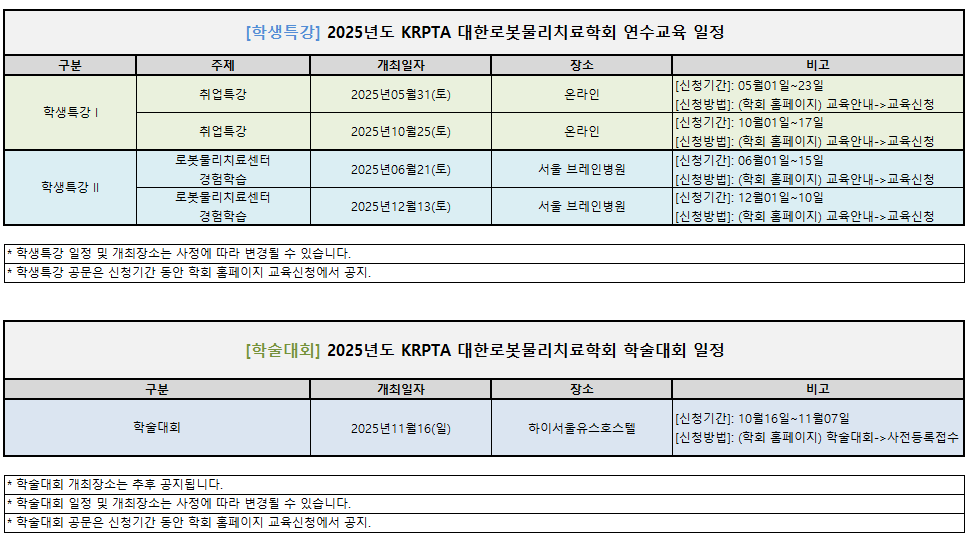 [KRTPA 대한로봇물리치료학회 2025년 연수교육 일정] 안녕하세요. KRPTA 대한로봇물리치료학회 입니다. 본회의 2025년 연수교육 일정을 아래와 같이 알려드립니다. ["(홈페이지)교육안내->교육일정" 에서도 확인 가능합니다.] 일정 중 추가된 부분 설명은 아래와 같습니다. ---------------------------------------------------------------------------------------------------- *전문심화강좌(Master Course): 정규과정으로써 Advanced 강좌 이수자만 참석가능, 3일간 로봇물리치료센터에서 치료과정 실습 및 치료노하우 숙지. *특별강좌 I, II, III: 로봇물리치료의 효율적인 적용 및 전반적인 이해를 돕기 위해 보행분석 및 로봇물리치료 통한 치료, 소아 로봇물리치료 개론, 로봇물리치료 수가 주제로 연 3회씩 개최. *학생특강: 취업정보 제공 및 로봇물리치료센터 경험학습 과정 개설. *학술대회: 11월 15(토) 학술대회 개최일 사전공지. ---------------------------------------------------------------------------------------------------- 많은 관심 바랍니다. 감사합니다.