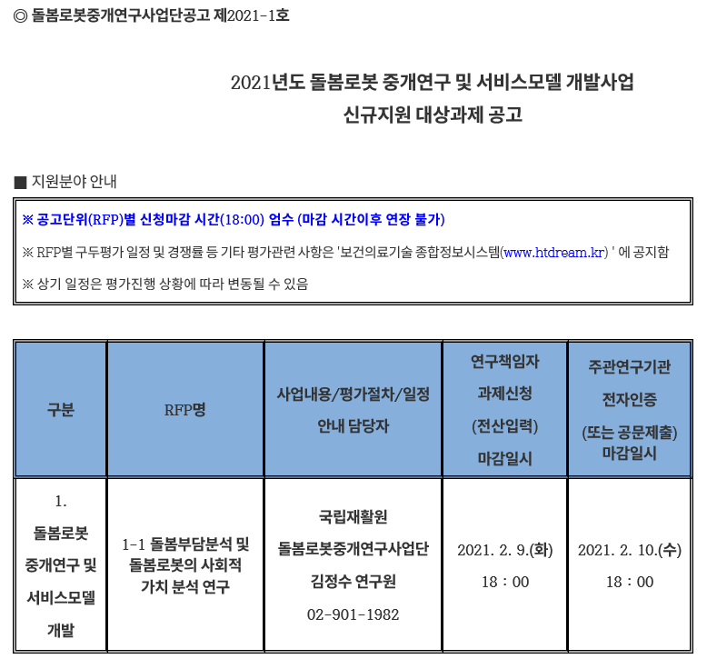 안녕하십니까? 보건복지부 국립재활원에서 2021년도 돌봄로봇 중개연구 및 서비스모델 개발사업 신규과제가 공고되어 아래와 같이 안내드립니다. 관련 연구자분들의 적극적인 참여 부탁드립니다. [자세한 내용 아래 링크 참조]