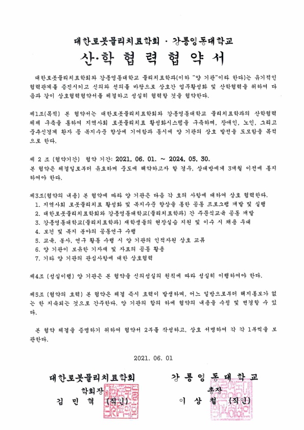 KRPTA 대한로봇물리치료학회와 강릉영동대학교는 전문기술 인재양성을 위해서 상호 상생발전과 지속적인 협력을 약속하고 산학협력협약을 체결하였습니다. 많은 관심에 감사드리고 더욱 발전하는 학회가 되도록 노력하겠습니다.