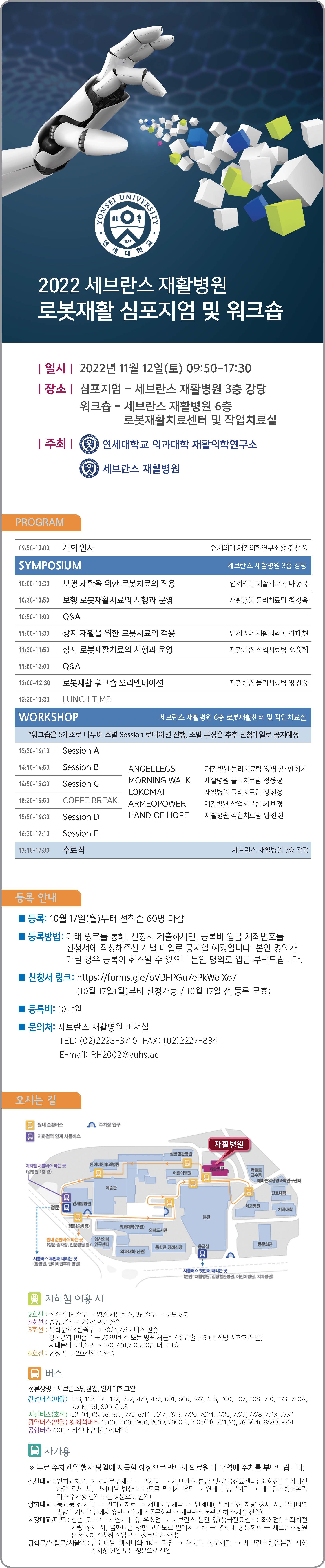| 장소 | 심포지엄 - 세브란스 재활병원 3층 강당 워크숍 - 세브란스 재활병원 6층 로봇재활치료센터 및 작업치료실