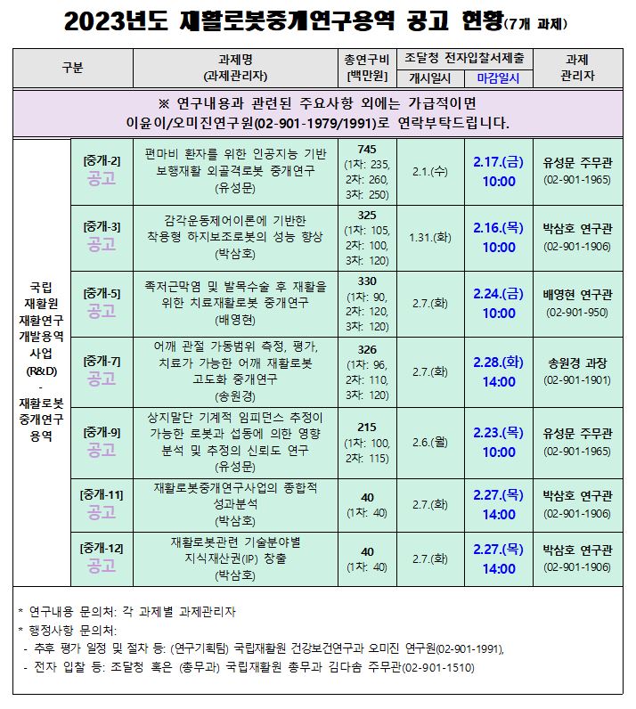 안녕하세요. *해당공고는 전자입찰로 진행됩니다. *e-발주시스템을 통해 사업계획서 및 관련서류를 필히 제출해주시고 서류제출과는 별도로 가격투찰(나라장터_지문등록필요)을 꼭 진행해주시기바랍니다. * 공고명: 2023년 국립재활원 재활로봇중개연구용역 과제 공고 (재활로봇중개연구사업 재활로봇중개연구용역) * 접수기한: 2023년 2월 28일(화) 14시까지 (과제별로 접수기한 상이하므로 주의) * 재활로봇중개연구사업 재활로봇중개연구용역 7개 과제 * 공고내용: 국립재활원 홈페이지 (http://www.nrc.go.kr) 입찰공고에서 검색 또는 국가종합전자조달시스템 * 접수처: ▪국가종합전자조달시스템 나라장터 홈페이지 전자시스템에 업로드 [유의사항] 본 공고에 대한 서류접수는 나라장터 홈페이지 전자시스템을 통해 진행되므로 신규업체/연구기관의 경우 조달청에 등록절차가 필요합니다. 모든 입찰은 지문투찰로 진행되며 지문등록을 위해 조달청 직접 방문이 필요합니다. (단, 지문인식 신원확인 예외적용 신청서를 제출한 입찰자 또는 지문인식 신원확인 예외자로 등록된 입찰자는 기존 인증서로 투찰이 가능합니다.) 공고 관련 안내사항 및 유의사항은 첨부1 문서를 참고바랍니다. ※ 신규업체/연구기관 등록 절차 안내는 나라장터 홈페이지 또는 첨부2 문서를 확인바랍니다. : 국가종합전자조달시스템 나라장터 홈페이지 이용문의 1588-0800/042-610-1200 ※ 제안서(사업계획서) 제출과 관련한 사항은 e-발주시스템 Q&A 또는 첨부3 문서를 참고해주시기바랍니다. : e-발주시스템(http://rfp.g2b.go.kr) 유지·운영팀 (070-4056-6414, 6134, 6467) [공고 관련 문의처] ◆ 입찰참가자격등록, 나라장터 시스템 문의 : 정부조달 콜센터(☎ 1588-0800) ◆ 입찰공고, 개찰, 계약방법 등 문의 : 국립재활원 총무과 김다솜 (☎ 02-901-1510) ◆ 제안서 온라인접수, 연구비 계상 문의, 제안서 평가방법 문의 : 국립재활원 재활로봇중개연구사업 간사 유성문 (☎ 02-901-1965)/ 운영팀 이윤이 (☎ 02-901-1979) ◆ 발주부서 연락처 : 제안요청서, 연구용역에 대한 상세 내역 등 문의 : 국립재활원 재활로봇중개연구사업 과제관리자 [중개-2] 유성문 주무관 (02-901-1965) 국립재활원 재활로봇중개연구사업 과제관리자 [중개-3] 박삼호 연구관 (02-901-1906) 국립재활원 재활로봇중개연구사업 과제관리자 [중개-5] 배영현 연구관 (02-901-1950) 국립재활원 재활로봇중개연구사업 과제관리자 [중개-7] 송원경 과장 (02-901-1901) 국립재활원 재활로봇중개연구사업 과제관리자 [중개-9] 유성문 주무관 (02-901-1965) 국립재활원 재활로봇중개연구사업 과제관리자 [중개-11] 박삼호 연구관 (02-901-1906) 국립재활원 재활로봇중개연구사업 과제관리자 [중개-12] 박삼호 연구관 (02-901-1906) |