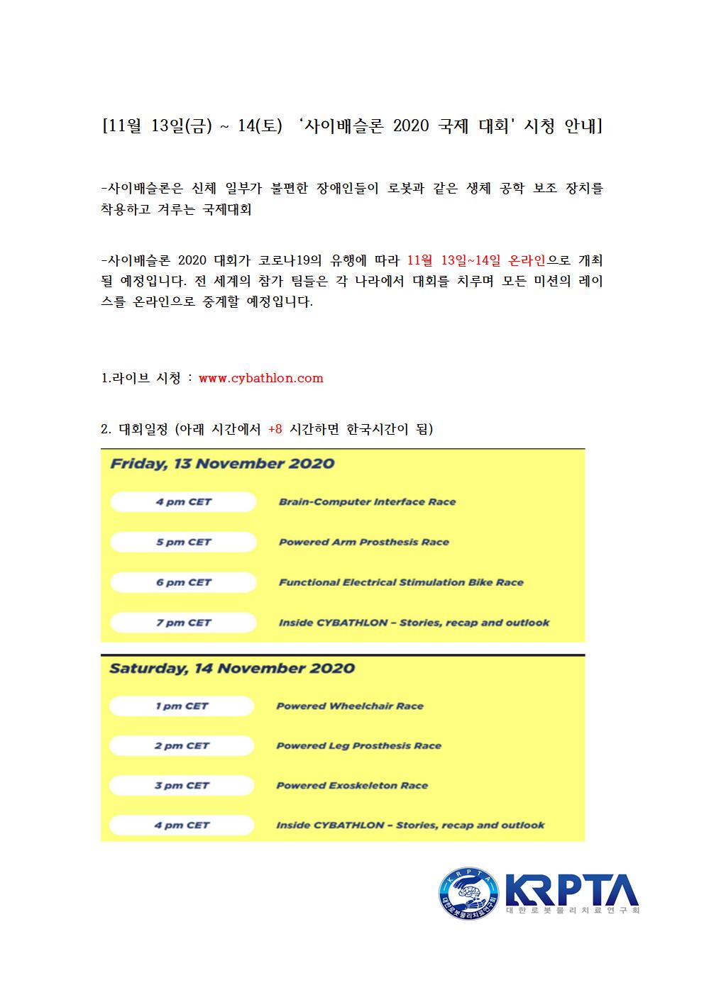 11월 13일(금) ~ 14(토) ‘사이배슬론 2020 국제 대회\' 시청 안내