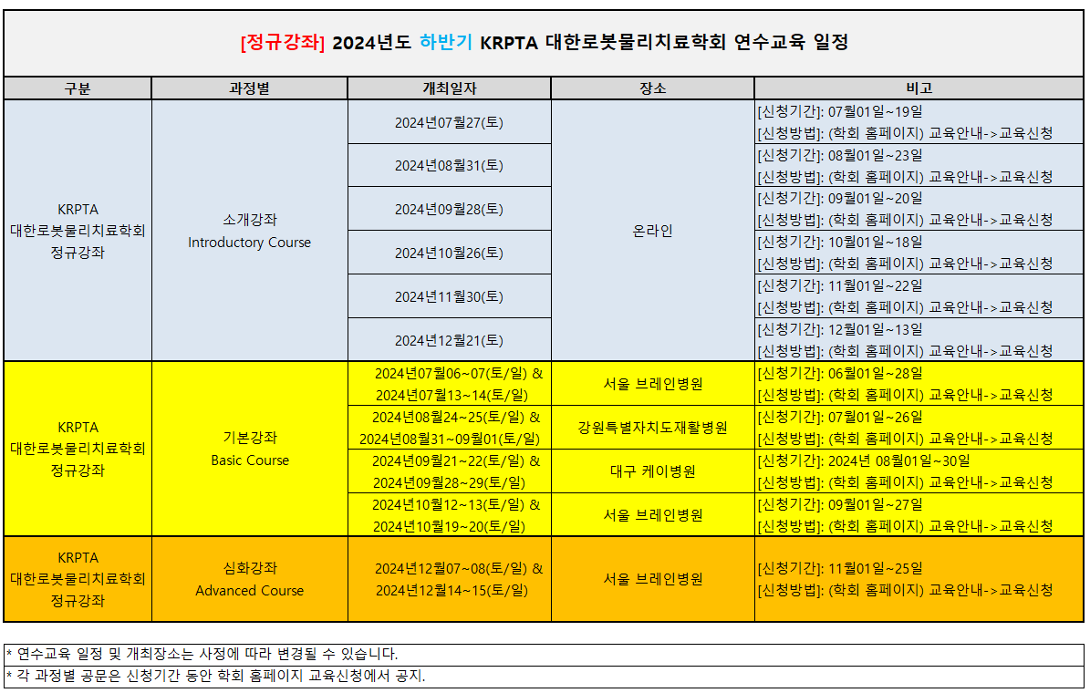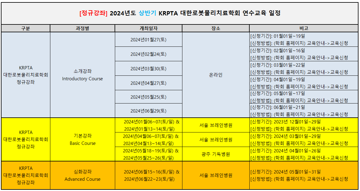 [KRTPA 대한로봇물리치료학회 2024년 연수교육 일정] 안녕하세요. KRPTA 대한로봇물리치료학회 입니다. 본회의 2024년 연수교육 일정을 아래와 같이 알려드립니다. ["(홈페이지)교육안내->교육일정" 에서도 확인 가능합니다.] 많은 관심바랍니다. 감사합니다.