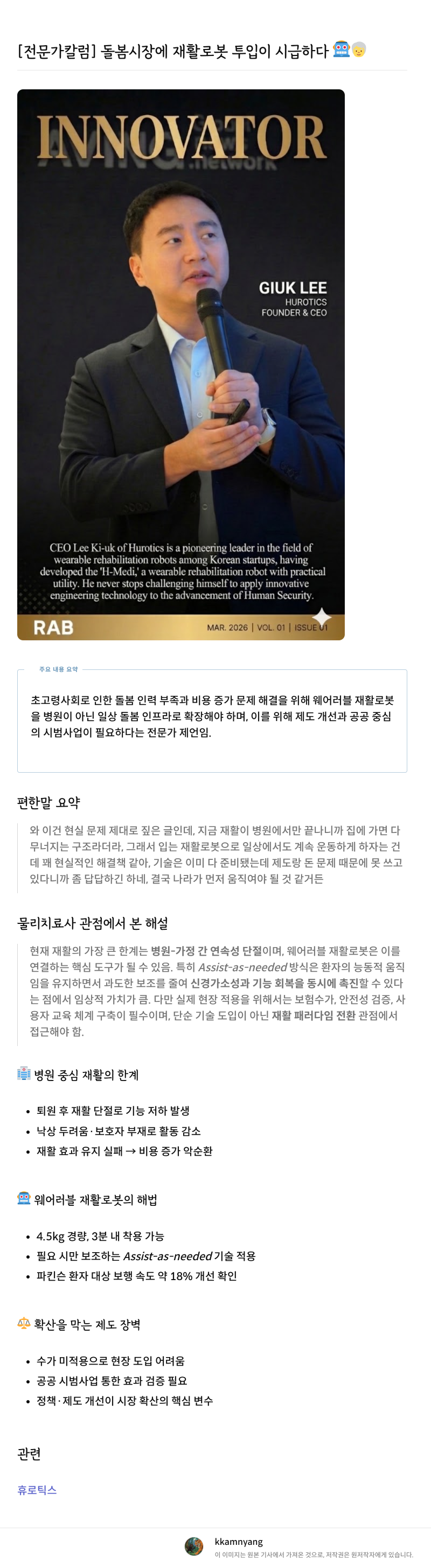 [전문가칼럼] 돌봄시장에 재활로봇 투입이 시급하다... I 이기욱 (휴로틱스 대표 / 중앙대 교수)