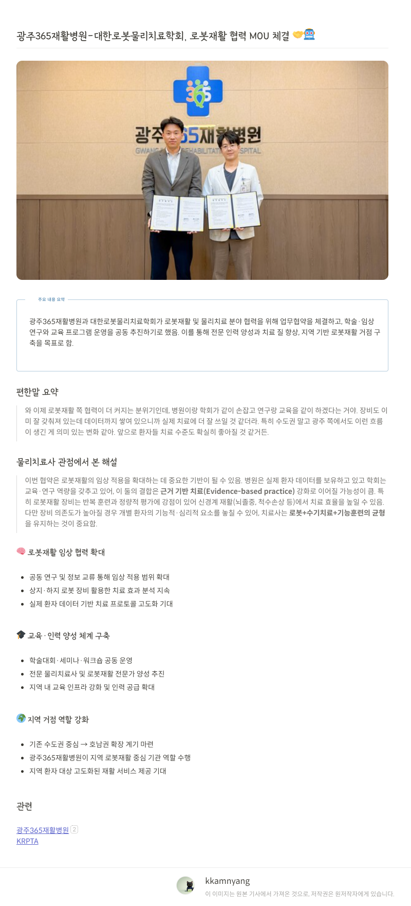 광주365재활병원, 대한로봇물리치료학회와 MOU