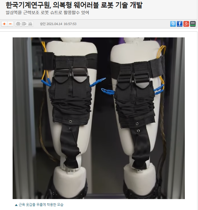 한국기계연구원(원장 박상진)은 박철훈 로봇메카트로닉스연구실 책임연구원 연구팀이 택배부터 건설 노동까지 근력이 필요한 작업 현장에서 쓸 수 있는 근육옷감 로봇 기술을 개발했다고 14일 밝혔다. 웨어러블 로봇은 크게 아이언맨 슈트처럼 딱딱한 외골격형과 스파이더맨 슈트처럼 부드러운 의복형으로 나뉜다. 연구팀은 스파이더맨 슈트처럼 가볍고 부드럽지만 근육처럼 스스로 힘을 낼 수 있는 의복형 웨어러블 로봇 기술을 개발했다. 머리카락 굵기 4분의 1 정도인 40㎛(마이크로미터) 두께 형상기억합금을 스프링 형태 실로 제작한 뒤 옷감을 짜듯 근육옷감을 직조했다. 옷감처럼 자르거나 접을 수 있고 무게는 종이컵 하나 정도인 6.6g에 불과하다. 근육 옷감은 전류 흐름에 따라 근육처럼 수축과 이완을 반복하며 힘을 내는 방식으로 작동한다. 자체 무게 1500배에 달하는 10㎏까지 들어올릴 수 있다. 연구팀은 다리나 팔에 근육 옷감을 붙인 뒤 앉았다 일어서기, 계단 오르기, 무거운 짐 들기 등 동작을 보조하는 실험을 진행한 결과, 평소 사용하던 근력의 절반에도 동작을 수행할 수 있었다고 설명했다. 형상기억합금을 스피링 실 형태로 만들어 근육 옷감을 직조하는 방식이어서, 기존 직조기로 대량생산도 가능할 전망이다. [출처] 로봇신문 |