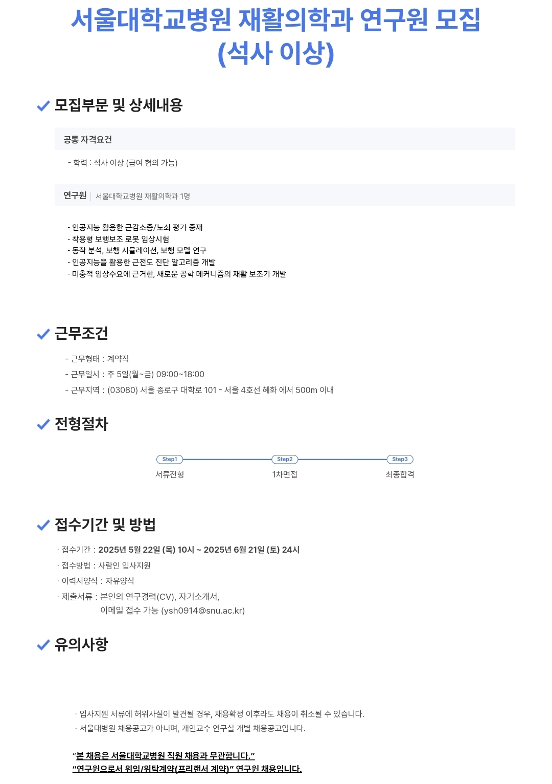 [서울대학교병원] 재활의학과 연구원 모집_웨어러블 로봇 임상시험, 보행분석 등 (~6/21)
