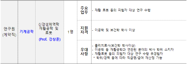 UNIST 공과대학 연구원 채용 공고입니다. 2020년 12월 23일 까지 지원서 접수이며, 재활로봇 관련 연구가 주요 업무이며, 물리치료사 학사 이상을 우대 모집하고 있습니다!~ 많은 관심 부탁드립니다. |