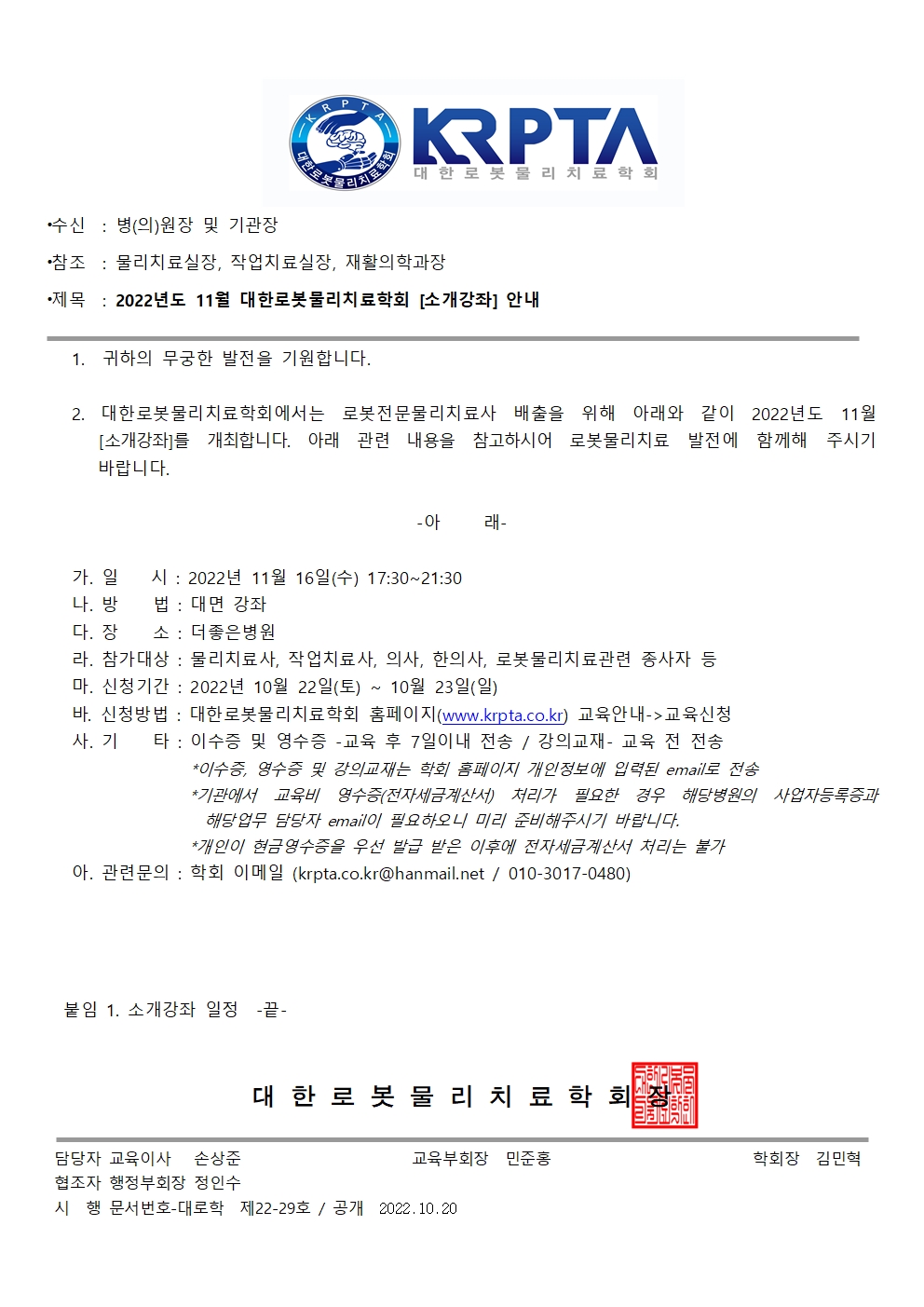[공문]KRPTA 대한로봇물리치료학회 22년도 11월[더좋은병원 소개강좌].pdf