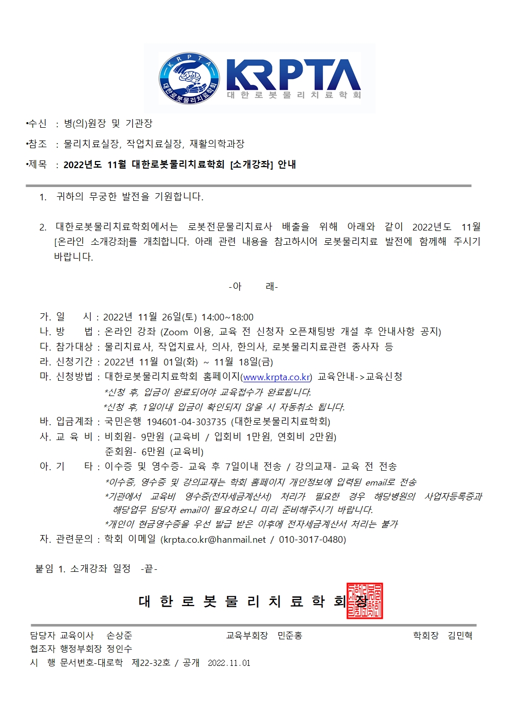 [공문]KRPTA 대한로봇물리치료학회 22년도 11월[온라인 소개강좌].pdf