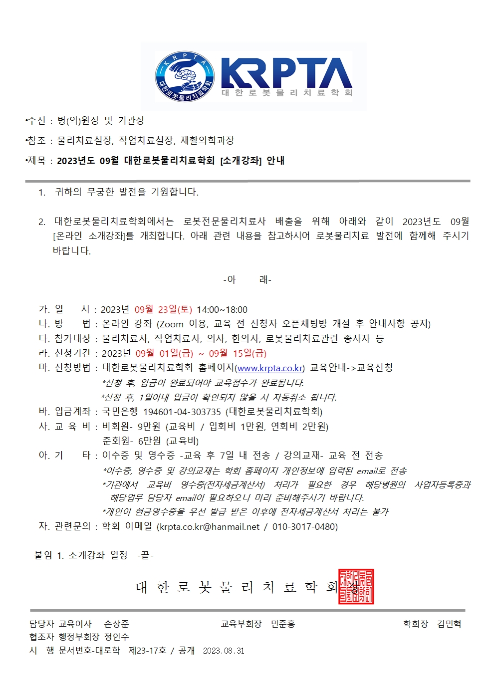 [공문]KRPTA 대한로봇물리치료학회 23년도 09월[온라인 소개강좌].pdf