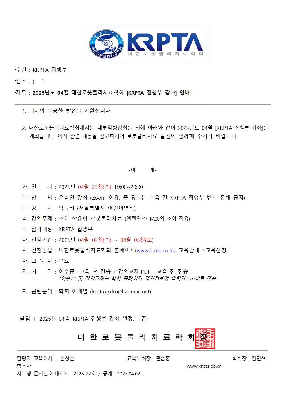 [공문]KRPTA 대한로봇물리치료학회 25년도 04월 집행부 강좌.pdf
