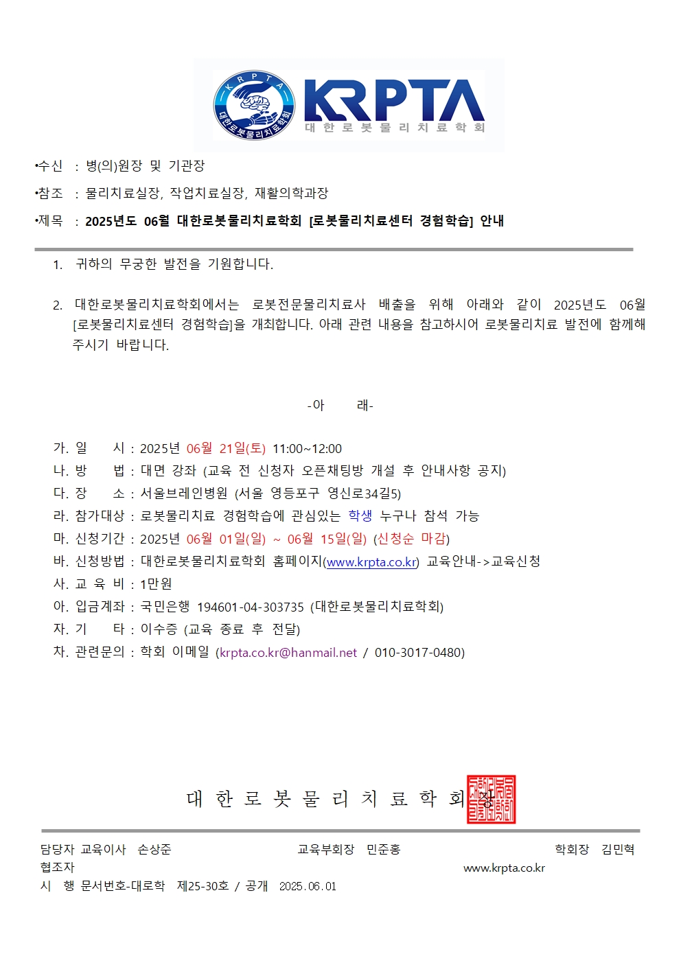 [공문][KRPTA 대한로봇물리치료학회] 25년도06월 로봇물리치료센터 경험학습.pdf