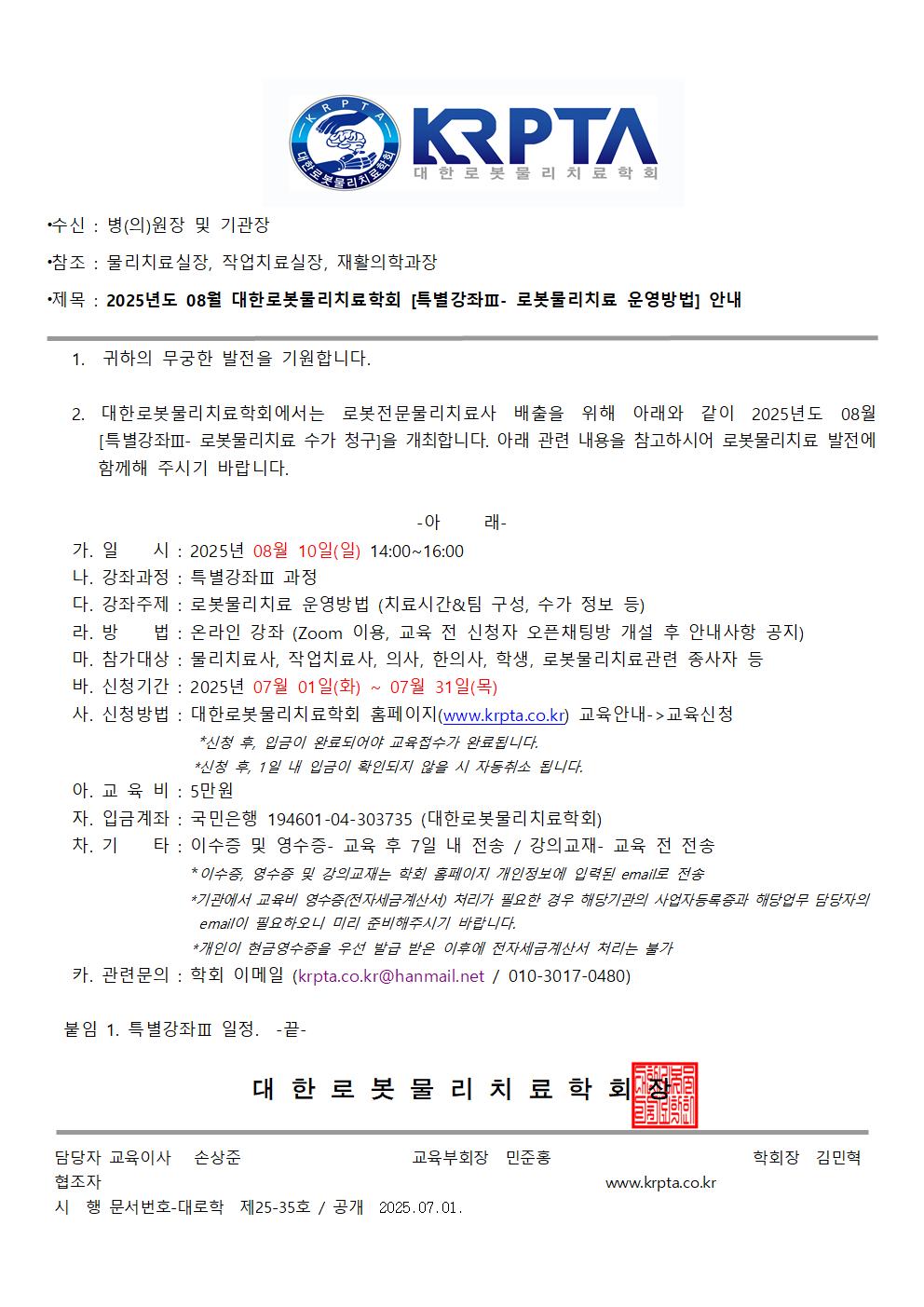 [공문] [KRPTA 대한로봇물리치료학회]25년도08월 특별강좌Ⅲ 개최 안내.pdf