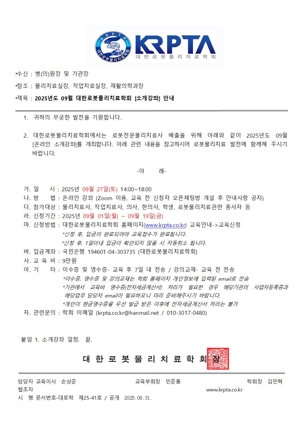[공문]KRPTA 대한로봇물리치료학회 25년도 09월[온라인 소개강좌].pdf
