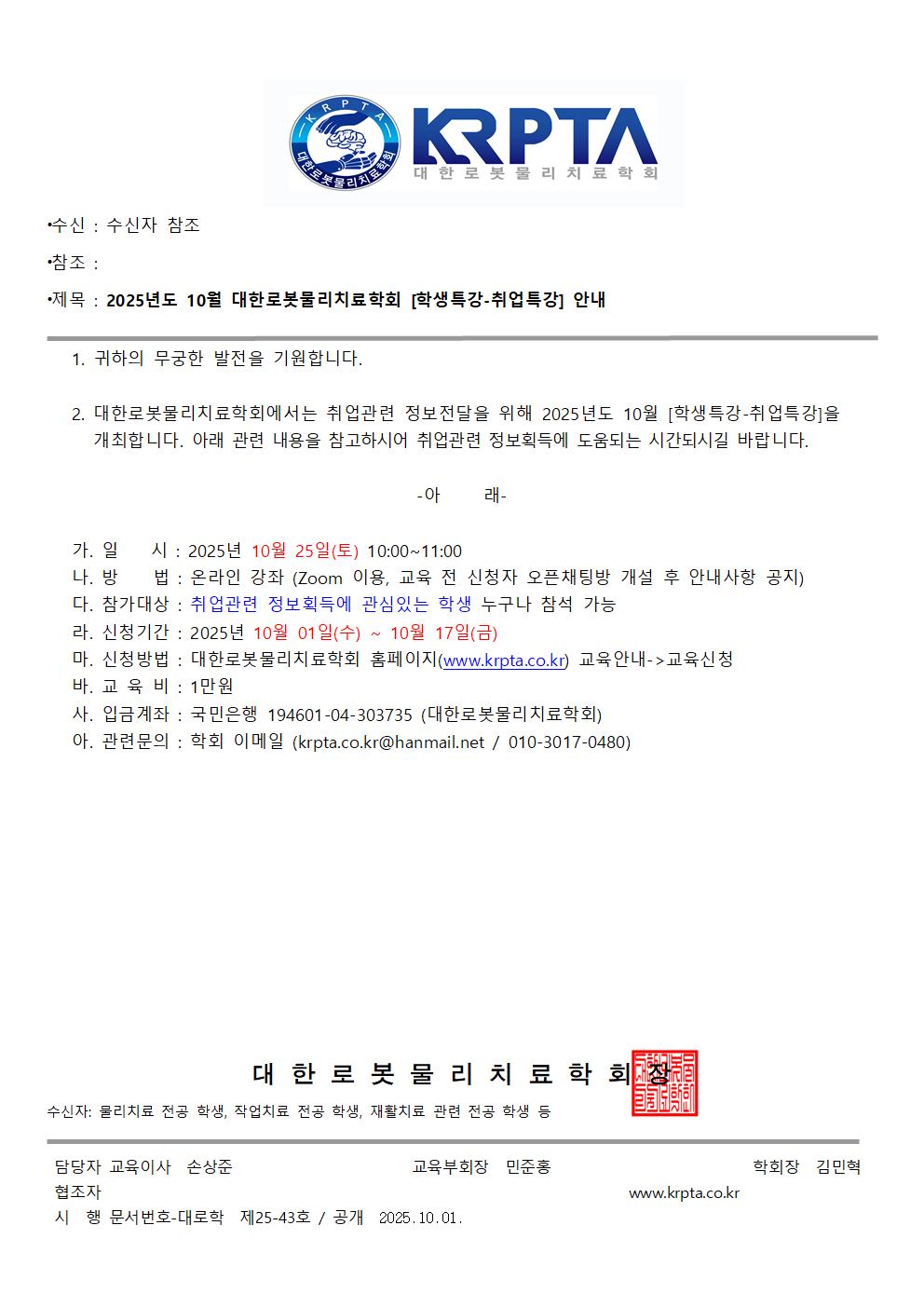 [공문]KRPTA 대한로봇물리치료학회 25년도 10월[학생특강-취업특강].pdf